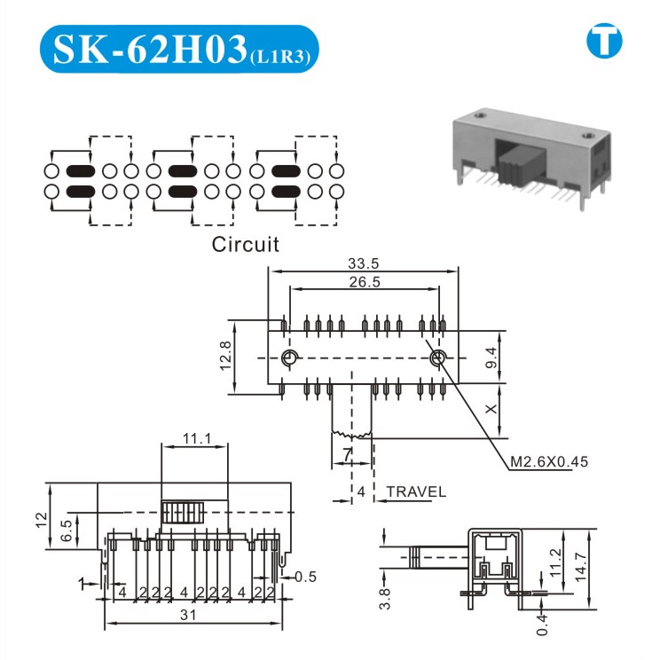 SK-62H03 詳細(xì)資料 產(chǎn)品說明: 技術(shù)指標(biāo): 使用溫度范圍 -20~+70℃ 耐壓 AC250V(50Hz)/min 額定負(fù)荷 DC 50V 0.5A 動作力 250±100gf 接觸電阻 ≤0.05Ω 機(jī)械壽命 10000次 絕緣電阻 ≥100MΩ