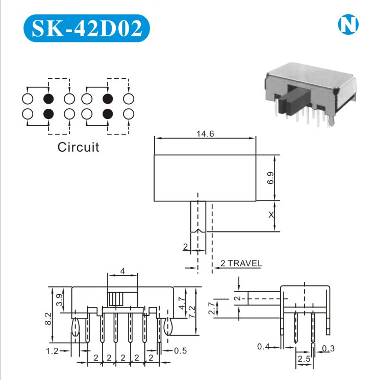 SK-42D02 詳細資料 產(chǎn)品說明: 技術指標: 使用溫度范圍 -20~+70℃ 耐壓 AC250V(50Hz)/min 額定負荷 DC 50V 0.5A 動作力 250±100gf 接觸電阻 ≤0.05Ω 機械壽命 10000次 絕緣電阻 ≥100MΩ