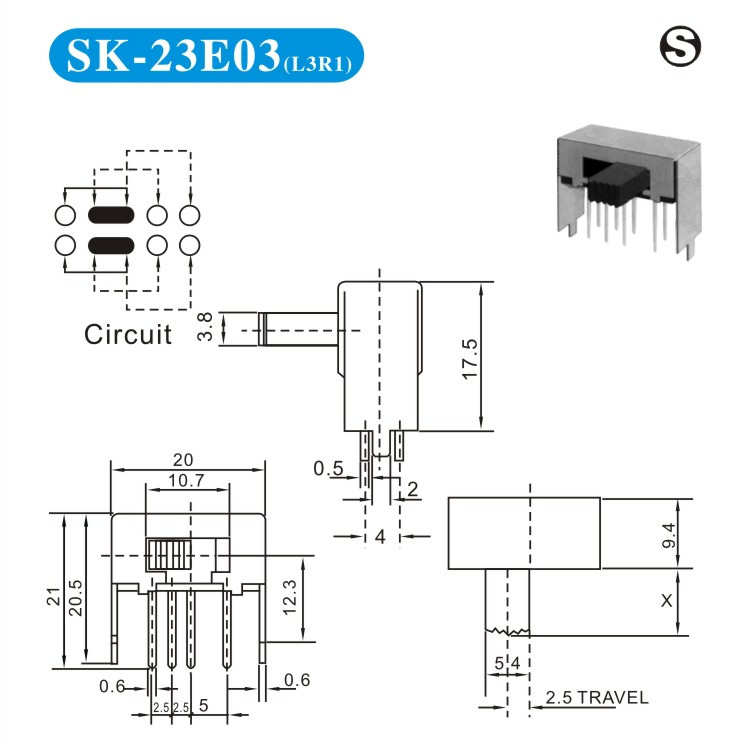 SK-23E03 詳細資料 產(chǎn)品說明: 技術(shù)指標: 使用溫度范圍 -20~+70℃ 耐壓 AC250V(50Hz)/min 額定負荷 DC 50V 0.5A 動作力 250±100gf 接觸電阻 ≤0.05Ω 機械壽命 10000次 絕緣電阻 ≥100MΩ