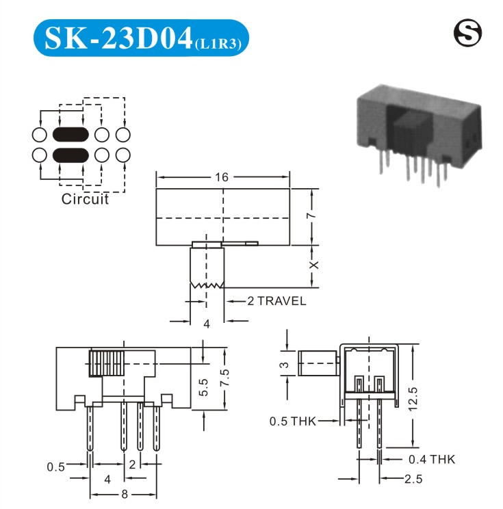 SK-23D04 詳細(xì)資料 產(chǎn)品說明: 技術(shù)指標(biāo): 使用溫度范圍 -20~+70℃ 耐壓 AC250V(50Hz)/min 額定負(fù)荷 DC 50V 0.5A 動(dòng)作力 250±100gf 接觸電阻 ≤0.05Ω 機(jī)械壽命 10000次 絕緣電阻 ≥100MΩ