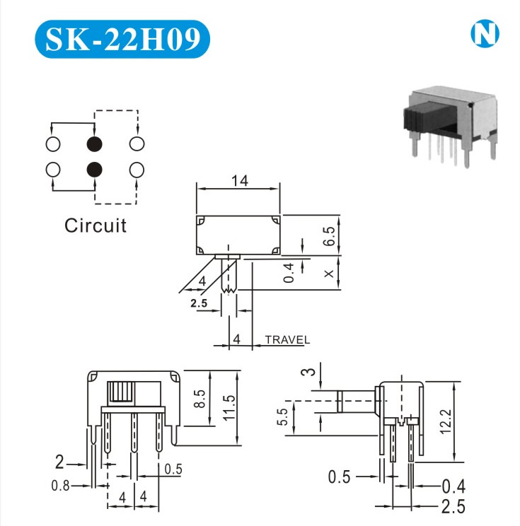 SK-22H09 詳細資料 產(chǎn)品說明: 技術(shù)指標(biāo): 使用溫度范圍 -20~+70℃ 耐壓 AC250V(50Hz)/min 額定負荷 DC 50V 0.5A 動作力 250±100gf 接觸電阻 ≤0.05Ω 機械壽命 10000次 絕緣電阻 ≥100MΩ