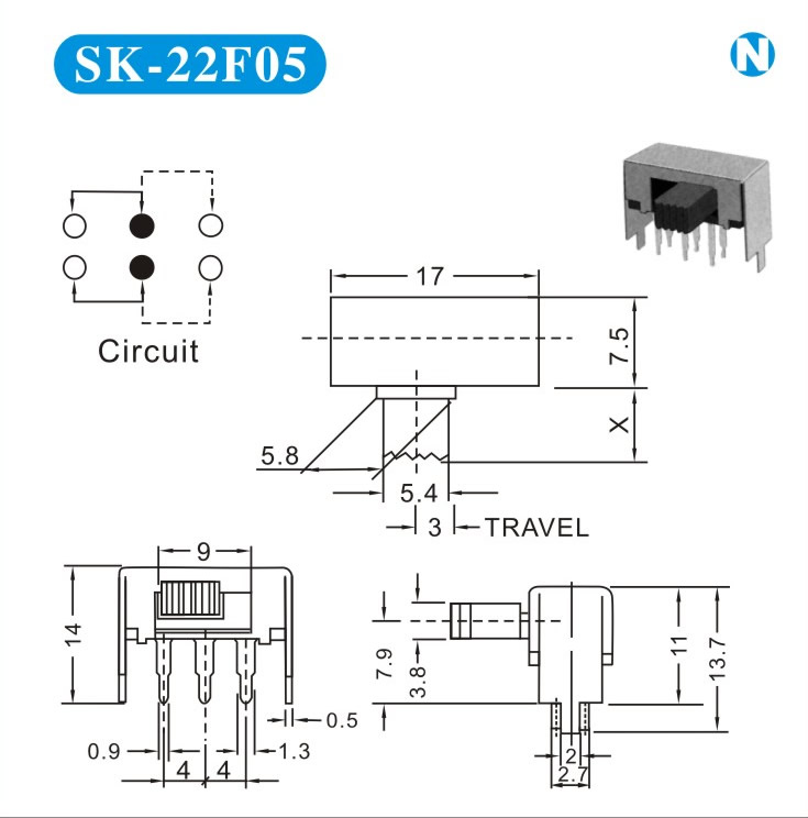 SK-22F05 詳細資料 產(chǎn)品說明: 技術指標: 使用溫度范圍 -20~+70℃ 耐壓 AC250V(50Hz)/min 額定負荷 DC 50V 0.5A 動作力 250±100gf 接觸電阻 ≤0.05Ω 機械壽命 10000次 絕緣電阻 ≥100MΩ